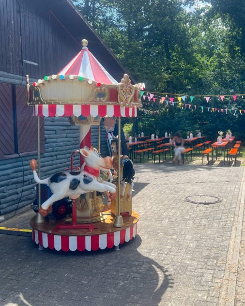 Aber nicht nur für öffentliche Feste ist dieses Karussell geeignet, auch bei einem Kindergeburtstag im eigenen Garten machen Sie damit mächtig Eindruck!